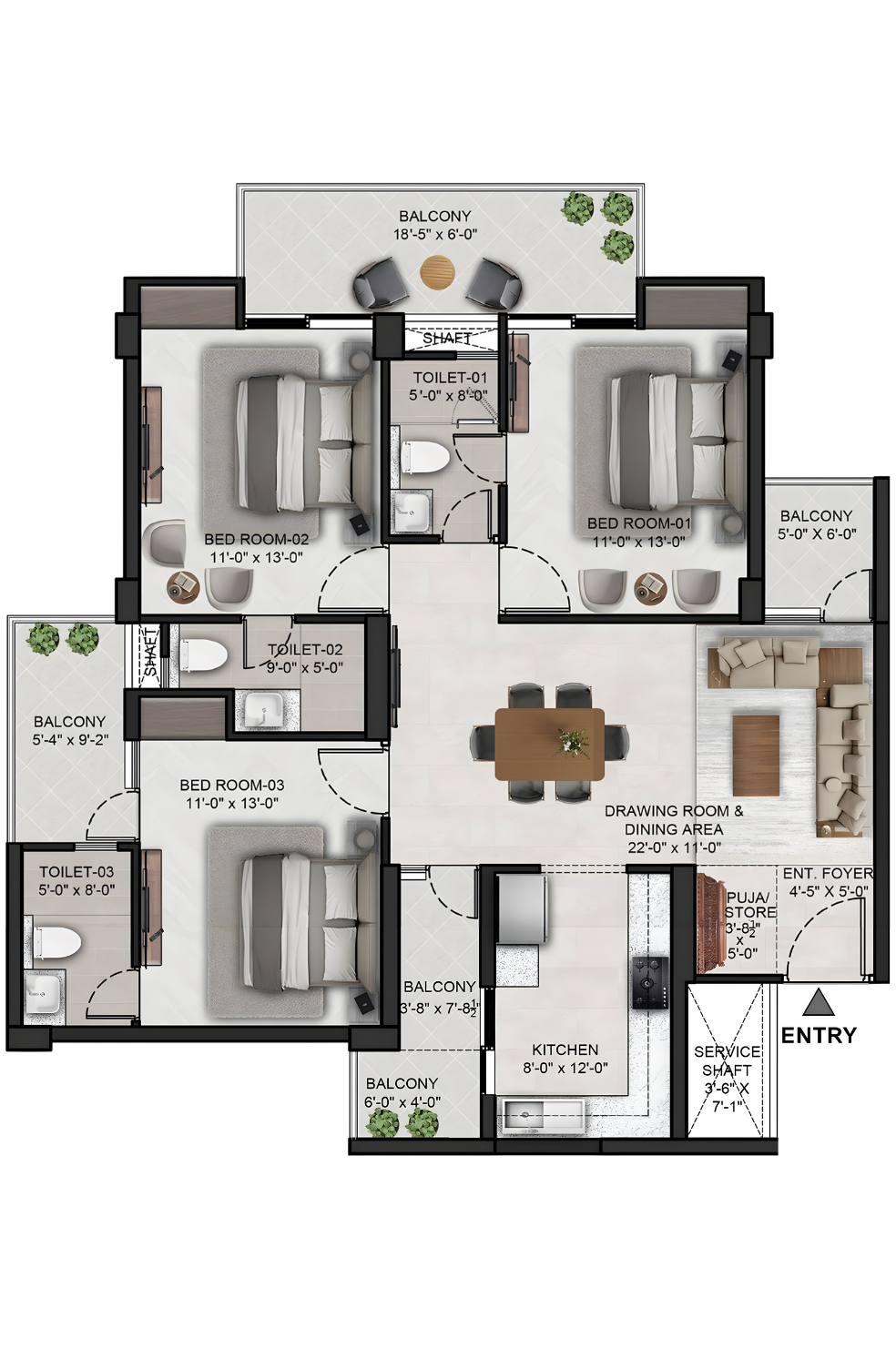 The 3 BHK – Option 1 apartment is thoughtfully designed to offer spacious interiors, functional zoning, and multiple balconies for enhanced light and ventilation. The layout seamlessly connects private bedrooms with a generous living and dining area, making it ideal for comfortable family living.