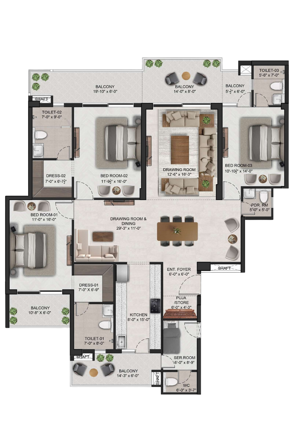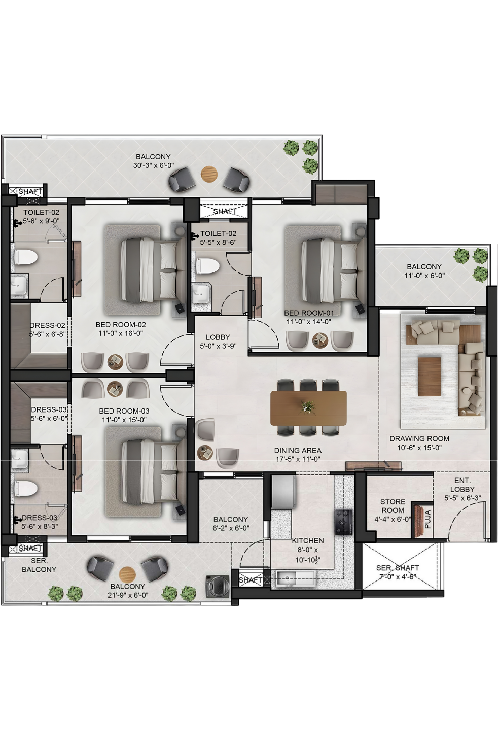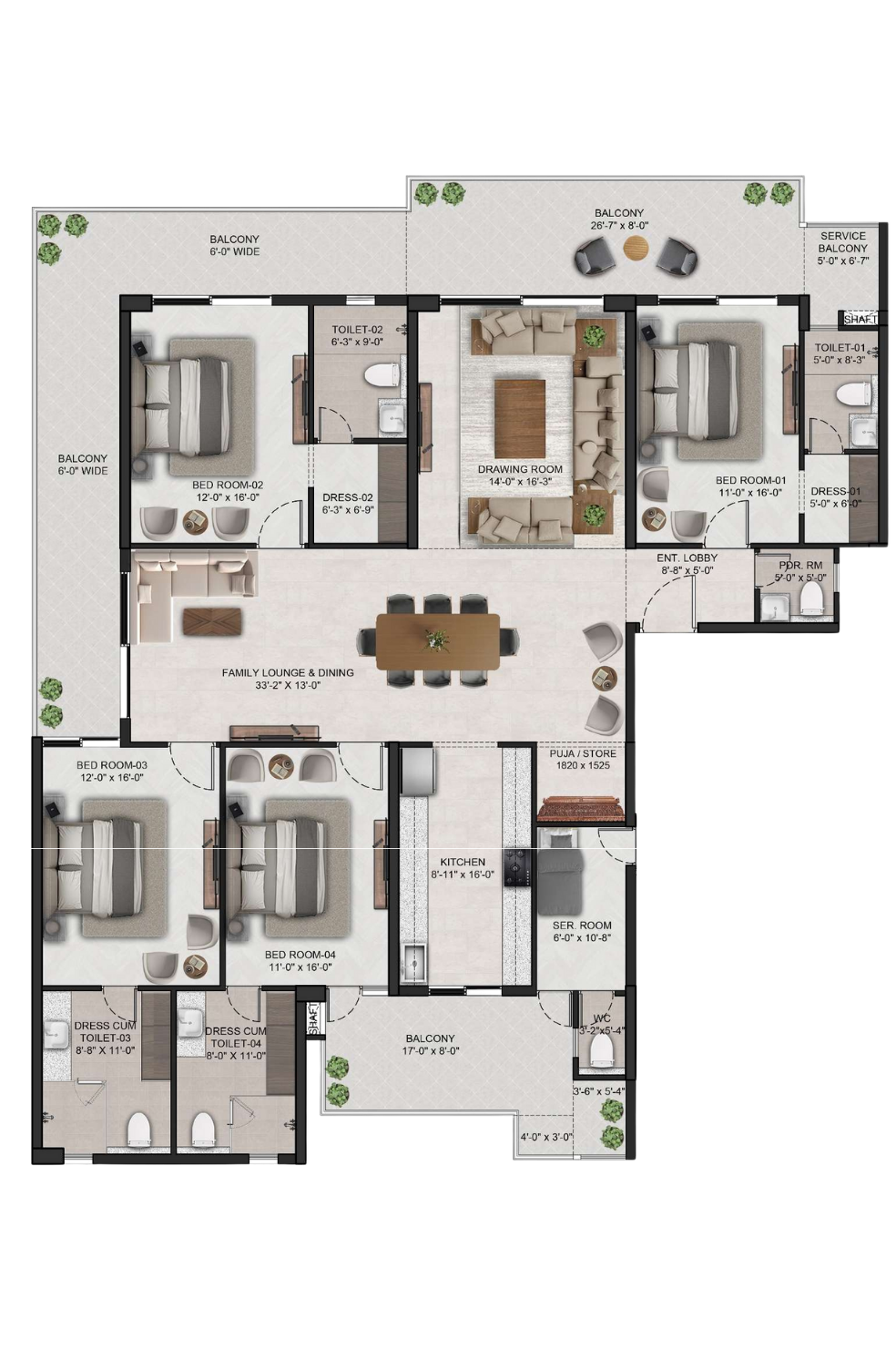 Spacious 4 BHK apartment with a large family lounge & dining area, a drawing room, and multiple balconies providing ample natural light. The layout includes a modern kitchen, puja/store, and a service room for added convenience.